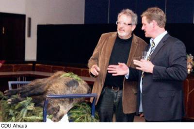 Im Programm folgten nach dem Abendessen – wohl zum letzten Mal in der Stadthalle von der Familie Rathmer zubereitet – die Tombola, der Zauberkünstler Endrik Thier mit erfrischenden Kunststücken, die Versteigerung des gespendeten Wildschweins mit neuem Auktionator Bernhard Roßmöller und die Ehrung langjähriger Mitglieder, die Bürgermeister Büter unter Assistenz der Ehrengäste und der Vorsitzenden vornahm.