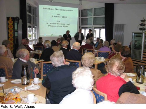 60 Seniorinnen und Senioren konnte der Vorsitzende der CDU-Seniorenunion Ahaus Heinrich Laing am Mittwoch, 15. Februar 2006, um 15.00 Uhr im Senioren- und Pflegezentrum des Ahauser Krankenhauses zu einem Informationsnachmittag begrüßen.