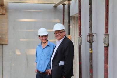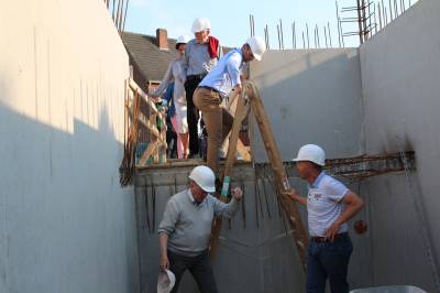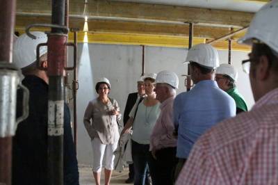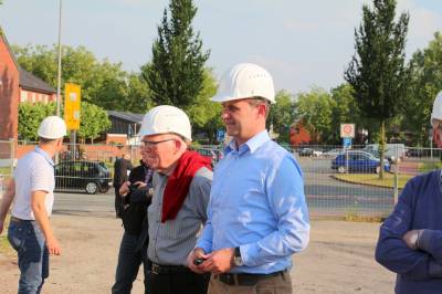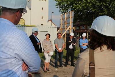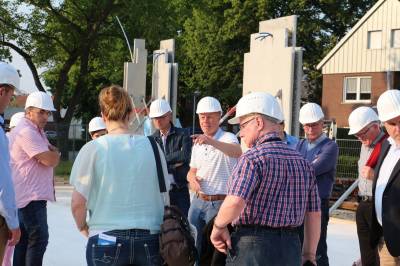 Im ersten Teil des Abends besichtigten die 30 Teilnehmer die Baustelle des Kulturzentrums. Die Herren Steggemann und Weil vom beauftragten Planungsbüro führten die Gruppe über die Baustelle und erläuterten den Baufortschritt sowie die nächsten Maßnahmen. Die vorhandenen Baukörper ließen bereits die Größe von Stadthalle und Bücherei erahnen. Ebenso waren schon Orchestergraben und Künstlerräume zu erkennen. Baudezernent Beckmann informierte über den zeitlichen Ablauf sowie die Baukosten und freute sich, dass beides im Rahmen der Planungen liege.