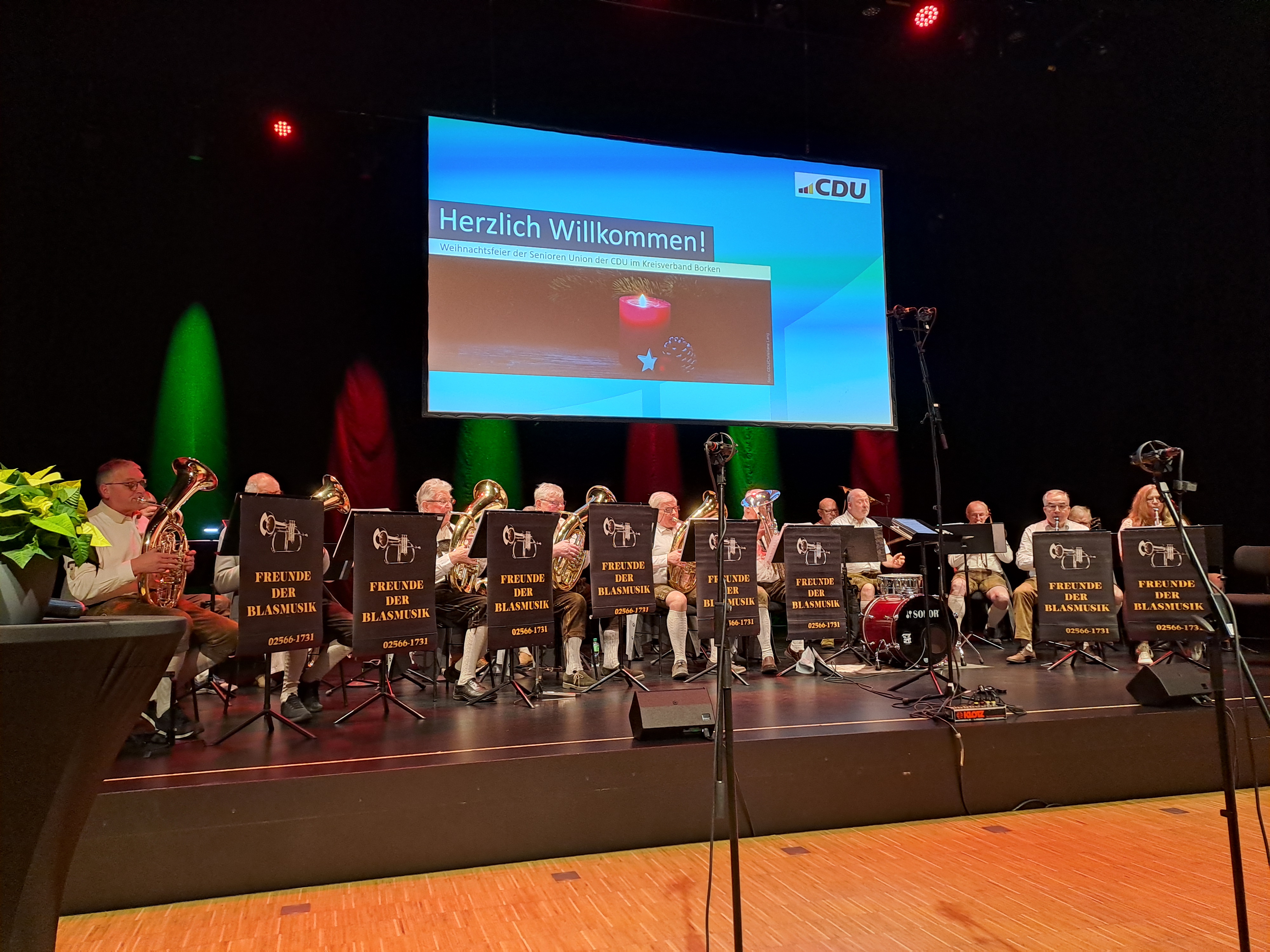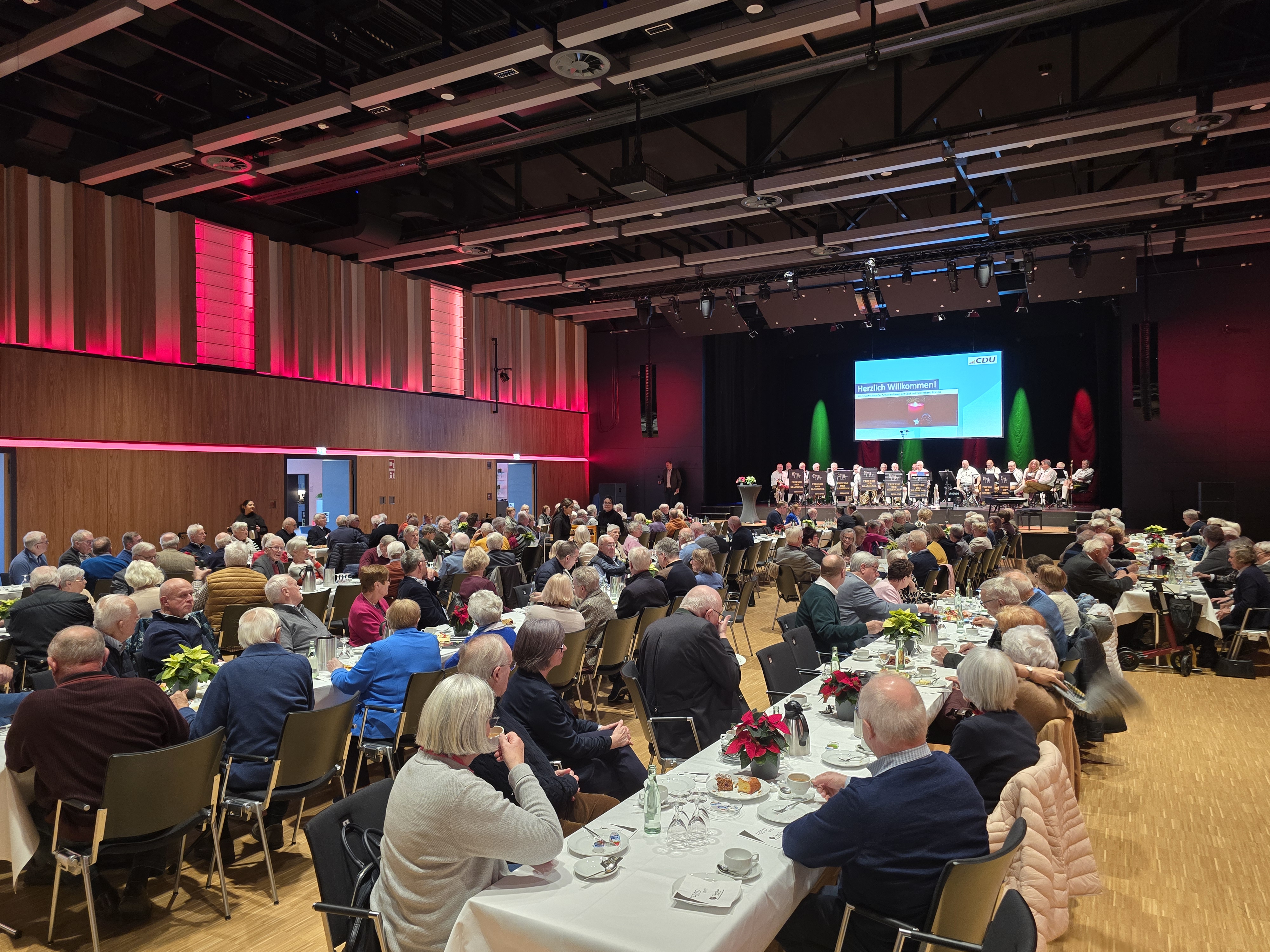 Landrat Dr. Kai Zwicker, Kreis-SEN-Vorsitzender Johannes Maus, stv. Bürgermeister Ahaus Thomas Vortkamp, Markus Jasper, Anna Bondaranko (beide Kreisgeschäftsstelle), Vorsitzender SEN Ahaus Aloys Schmeing (v.l.n.r.)Schauplatz des traditionellen Jahresausklangs war das Kulturquadrat in Ahaus, das sich für diesen Anlass in einen einladenden, festlich geschmückten Veranstaltungsort verwandelte. Aloys Schmeing, Vorsitzender der Senioren-Union Ahaus, hatte ein vielseitiges Programm zusammengestellt, das die über 200 Besucherinnen und Besucher von Beginn an in eine heitere Atmosphäre versetzte. Sein Ziel, Gemeinschaft zu stärken und gleichzeitig informative Akzente zu setzen, spiegelte sich im gesamten Ablauf des Nachmittags wider. Ein Höhepunkt war der Beitrag von Landrat Kai Zwicker, der unter dem Motto „50 Jahre Kreis Borken“ einen anschaulichen Rückblick auf die Entwicklung der Region bot. Mit lebendigen Beispielen und kleinen Anekdoten, untermalt von einem Kurzfilm, brachte er den Gästen die Bedeutung dieses Jubiläums nahe und sorgte für zahlreiche zustimmende Reaktionen. Musikalisch begleitet wurde die Veranstaltung von den „Freunden der Blasmusik“ aus Legden, deren warm klingende Stücke festliche Stimmung verbreiteten. Ebenso begeisterte der Kinderchor aus Wessum unter der Leitung von Jennifer Thesing, der mit klaren Stimmen und sichtbarer Freude mehrere Lieder präsentierte und damit für einen besonders herzlichen Moment sorgte. Grußworte überbrachten im Verlauf des Nachmittags der Kreisvorsitzende der Senioren-Union, Johannes Maus, sowie der stellvertretende Bürgermeister von Ahaus, Thomas Vortkamp. Beide würdigten das Engagement der Senioren-Union und betonten ihre Bedeutung für das gesellschaftliche Miteinander im Kreis. Eine zusätzliche Überraschung war die Videobotschaft von Bundespolitiker Jens Spahn, der den Anwesenden persönliche Grüße übermittelte und die Bedeutung ehrenamtlicher Arbeit hervorhob. Die Moderation des Programms lag in den Händen von Dr. Michael Räckers, der mit Ruhe und Humor durch den Nachmittag führte und die verschiedenen Programmpunkte elegant miteinander verband. Am Ende waren sich alle einig: Der Jahresausklang der Senioren-Union im Kulturquadrat war nicht nur ein rundum gelungener Abschluss, sondern auch ein inspirierender Auftakt für das kommende Jahr – geprägt von Gemeinschaft, Engagement und lebendiger Tradition.