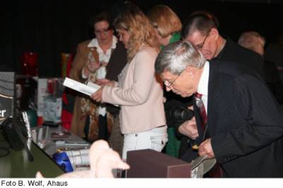Im Programm folgten nach dem Abendessen – wohl zum letzten Mal in der Stadthalle von der Familie Rathmer zubereitet – die Tombola, der Zauberkünstler Endrik Thier mit erfrischenden Kunststücken, die Versteigerung des gespendeten Wildschweins mit neuem Auktionator Bernhard Roßmöller und die Ehrung langjähriger Mitglieder, die Bürgermeister Büter unter Assistenz der Ehrengäste und der Vorsitzenden vornahm.