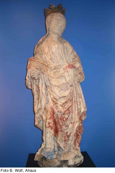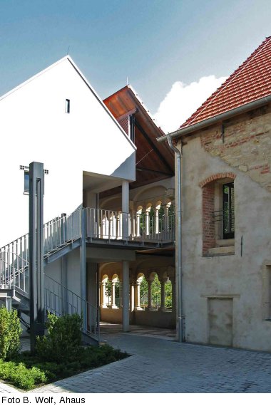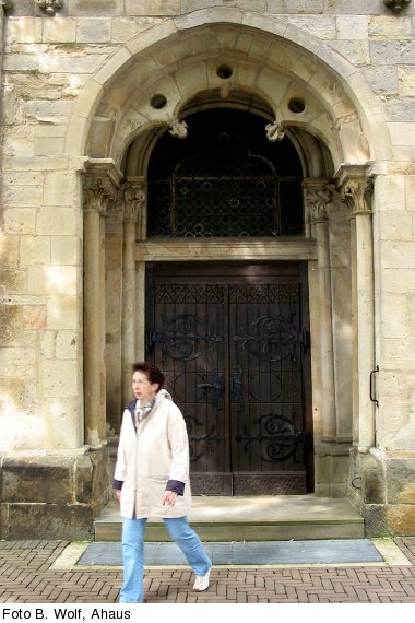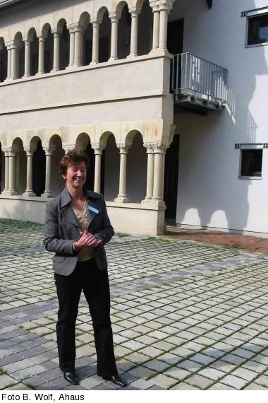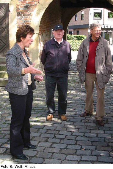 Die Radfahrergruppe erreichte unter der Führung des ehemaligen Bürgermeisters Dr. Dirk Korte nach gemächlicher Fahrt südlich an der Düstermühle vorbei gegen 10.15 Uhr den Kirchplatz in Asbeck. Dort begrüßte sie die Vorsitzende des Heimatvereins Asbeck und stellvertretende Bürgermeisterin von Legden Frau Maria Pier-Bohne, der die Radfahrer zunächst einmal zur Erlangung des Titels "Golddorf" für ihren Ort herzlich gratulierten. Frau Pier-Bohne bedankte sich im Namen des Heimatvereins und der übrigen Dorfbewohner und übernahm die Führung durch das Dormitorium, den Stiftsbezirk, das Äbtissinnenhaus, das Backhaus, die Hunnenpoate und die Stifts- und Pfarrkirche.