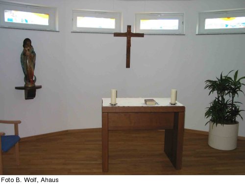 Dazu ist das V-förmig angelegte Haus in vier Hausgemeinschaften mit je 12 Appartements aufgeteilt, die rechts und links eines Begegnungsraumes vom Eingang zweigeschossig abzweigen. Im Obergeschoss befindet sich über dem Begegnungsraum ein ansprechend gestalteter Raum der Stille, der dem persönlichen Stillewerden, aber auch gottesdienstlichen Feiern dient. Die Hausgemeinschaften haben einen eigenen Gemeinschaftsraum und ein Dienstzimmer, in dem den ganzen Tag über eine vertraute Bezugsperson zu erreichen ist.