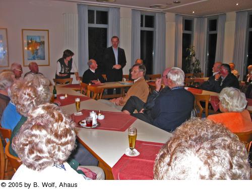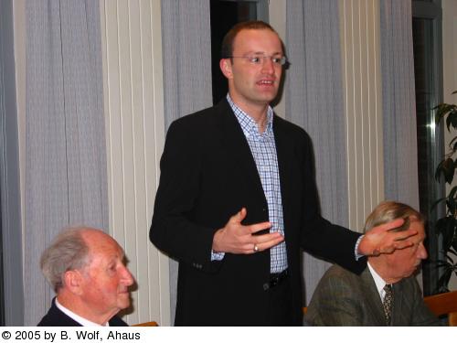 In der anschließenden lebhaften Diskussion erklärte Spahn, dass es ihm nicht möglich sei, den PDS-Vorsitzenden Lothar Bisky wegen dessen Kadervergangenheit in der DDR zum stellvertretenden Bundestagspräsidenten zu wählen, grundsätzlich gestand er der Linkspartei aber einen Stellvertreter in diesem Amt zu. Auf Rentenkürzungen angesprochen erklärte Spahn, durch die vom Rentengesetz aus dem Jahre 1959 festgelegte Kopplung der Renten an die Löhne komme es notwendigerweise zu einer Rentenkürzung, wenn das allgemeine Lohneinkommen sinke. Bei den Beschlüssen zur Rentenreform gehe es darum, auf den Bevölkerungsrückgang zu reagieren und auch zu berücksichtigen, dass längere Lebenserwartung bei durchweg guter Gesundheit auch zu einer längeren Lebensarbeitszeit führen müssten. Ziel der diesbezüglich beabsichtigten Maßnahmen sei es, die Sozialsysteme für die Zukunft fit zu machen, damit auch in fünfzig Jahren Existenz und Gesundheit der Menschen gesichert sind.