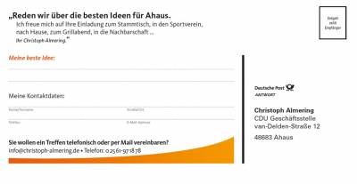 Klar ist, dass ein Bürgermeister nah bei den Menschen sein muss, das Ohr an den Problemen, Sorgen und Nöten haben muss. Genau mit diesem Ziel tritt Christoph Almering an, dies ist seine Maxime. Daher ist zentrales Element in de kommenden Wochen und Monaten, zu den Ahauser Bürgerinnen und Bürgern zu kommen. Jeder kann Christoph Almering zu sich einladen, zu seinem Stammtisch, Vereinstreffen, Fest! Nutzen Sie die Gelegenheit, mit Christoph Almering ins Gespräch zu kommen, geben Sie ihm mit auf den Weg, was Ihnen für Ahaus, Alstätte, Graes, Ottenstein, Wessum und Wüllen auf der Seele liegt und diskutieren Sie mit Christoph Almering über die besten Ideen für Ahaus!
