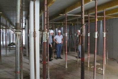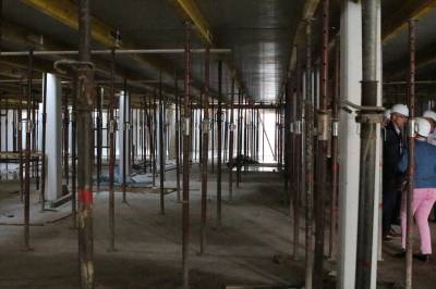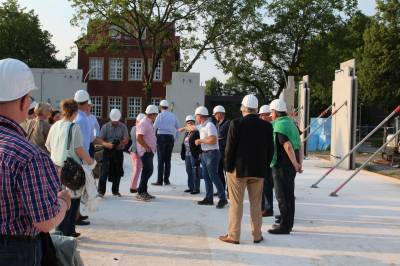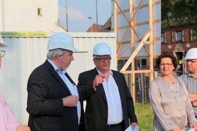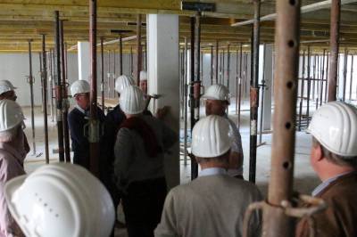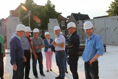 Im ersten Teil des Abends besichtigten die 30 Teilnehmer die Baustelle des Kulturzentrums. Die Herren Steggemann und Weil vom beauftragten Planungsbüro führten die Gruppe über die Baustelle und erläuterten den Baufortschritt sowie die nächsten Maßnahmen. Die vorhandenen Baukörper ließen bereits die Größe von Stadthalle und Bücherei erahnen. Ebenso waren schon Orchestergraben und Künstlerräume zu erkennen. Baudezernent Beckmann informierte über den zeitlichen Ablauf sowie die Baukosten und freute sich, dass beides im Rahmen der Planungen liege.