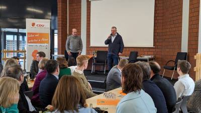 Nach Grußworten und dem Blick auf den städtischen Haushaltsentwurf durch den Stadtverbandsvorsitzenden Jörg Blisniewski und den Fraktionsvorsitzenden Dr. Michael Räckers begrüßte Mark Beule den stellvertretenden Vorsitzenden der Deutschen Polizeigewerkschaft (DPolG) Manuel Ostermann. Gemeinsam mit Michael Räckers diskutierte er mit Manuel Ostermann über die aktuelle Sicherheitslage sowie die großen Herausforderungen des Polizeiberufs. Herr Ostermann machte sehr deutlich, dass die Tätigkeit des Polizeibeamten für ihn nicht nur ein Beruf, sondern eine echte Berufung ist und er mit Leib und Seele für seinen Beruf brennt. Deutlich sprach er Themen wie den weit verbreiteten Fachkräftemangel an, gewährte viele spannende Einblicke in den Polizeialltag und sprach offen auch über bestehende Probleme.