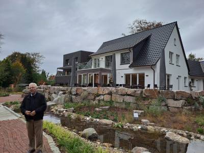 Dr. Ralf Gerl verwirklichte in Ahaus auf dem Eckgrundstück an der Schorlemer Straße / Ecke Eichengrund eine lang angedachte Idee: Vier Häuser, in der Mitte eine uralte Blutbuche, nachhaltig errichtete moderne Wohnungen. Jede der 22 Wohnungen ist ein Unikat. Die nachhaltige Holzbauweise sorgt für ein wohngesundes Klima.