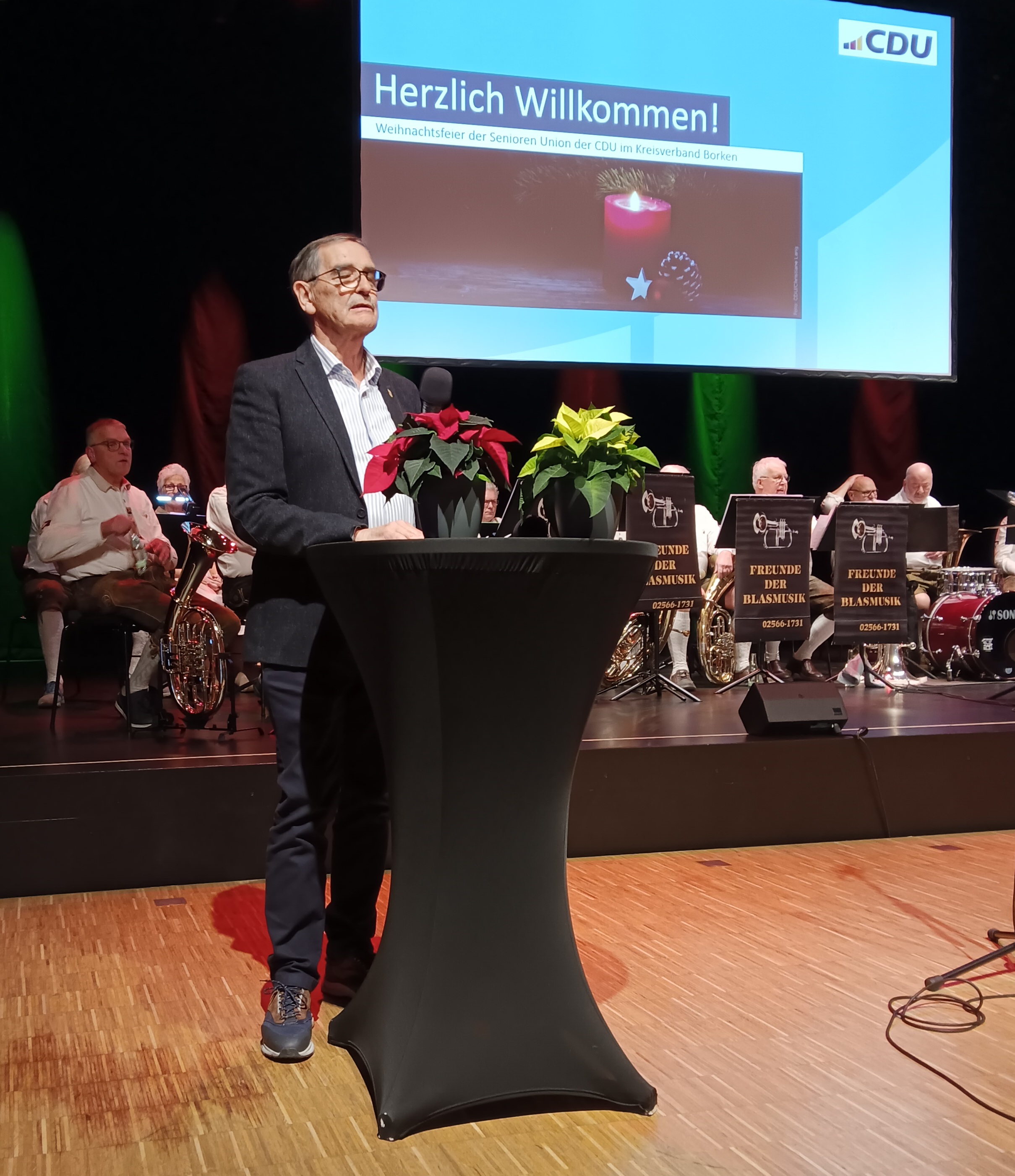 Landrat Dr. Kai Zwicker, Kreis-SEN-Vorsitzender Johannes Maus, stv. Bürgermeister Ahaus Thomas Vortkamp, Markus Jasper, Anna Bondaranko (beide Kreisgeschäftsstelle), Vorsitzender SEN Ahaus Aloys Schmeing (v.l.n.r.)Schauplatz des traditionellen Jahresausklangs war das Kulturquadrat in Ahaus, das sich für diesen Anlass in einen einladenden, festlich geschmückten Veranstaltungsort verwandelte. Aloys Schmeing, Vorsitzender der Senioren-Union Ahaus, hatte ein vielseitiges Programm zusammengestellt, das die über 200 Besucherinnen und Besucher von Beginn an in eine heitere Atmosphäre versetzte. Sein Ziel, Gemeinschaft zu stärken und gleichzeitig informative Akzente zu setzen, spiegelte sich im gesamten Ablauf des Nachmittags wider. Ein Höhepunkt war der Beitrag von Landrat Kai Zwicker, der unter dem Motto „50 Jahre Kreis Borken“ einen anschaulichen Rückblick auf die Entwicklung der Region bot. Mit lebendigen Beispielen und kleinen Anekdoten, untermalt von einem Kurzfilm, brachte er den Gästen die Bedeutung dieses Jubiläums nahe und sorgte für zahlreiche zustimmende Reaktionen. Musikalisch begleitet wurde die Veranstaltung von den „Freunden der Blasmusik“ aus Legden, deren warm klingende Stücke festliche Stimmung verbreiteten. Ebenso begeisterte der Kinderchor aus Wessum unter der Leitung von Jennifer Thesing, der mit klaren Stimmen und sichtbarer Freude mehrere Lieder präsentierte und damit für einen besonders herzlichen Moment sorgte. Grußworte überbrachten im Verlauf des Nachmittags der Kreisvorsitzende der Senioren-Union, Johannes Maus, sowie der stellvertretende Bürgermeister von Ahaus, Thomas Vortkamp. Beide würdigten das Engagement der Senioren-Union und betonten ihre Bedeutung für das gesellschaftliche Miteinander im Kreis. Eine zusätzliche Überraschung war die Videobotschaft von Bundespolitiker Jens Spahn, der den Anwesenden persönliche Grüße übermittelte und die Bedeutung ehrenamtlicher Arbeit hervorhob. Die Moderation des Programms lag in den Händen von Dr. Michael Räckers, der mit Ruhe und Humor durch den Nachmittag führte und die verschiedenen Programmpunkte elegant miteinander verband. Am Ende waren sich alle einig: Der Jahresausklang der Senioren-Union im Kulturquadrat war nicht nur ein rundum gelungener Abschluss, sondern auch ein inspirierender Auftakt für das kommende Jahr – geprägt von Gemeinschaft, Engagement und lebendiger Tradition.